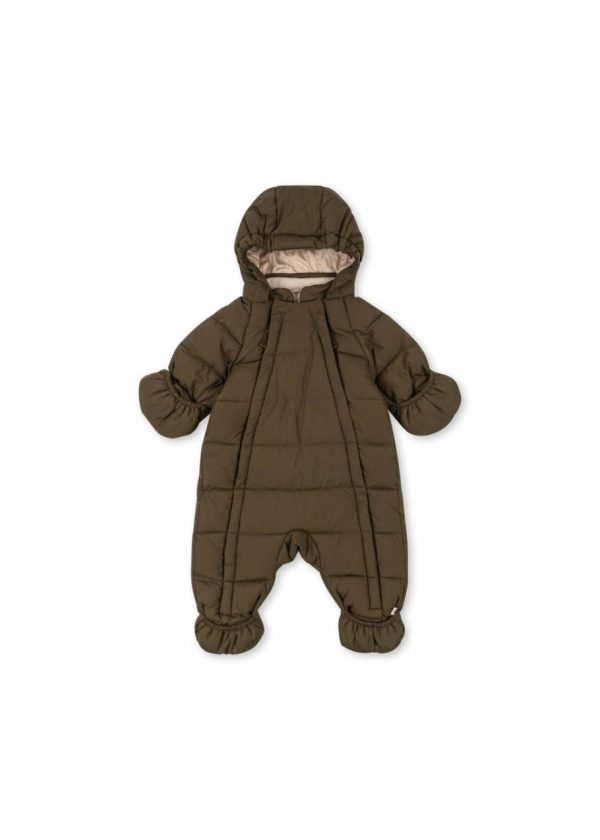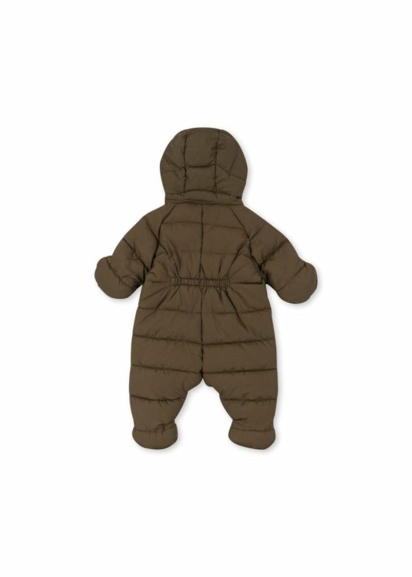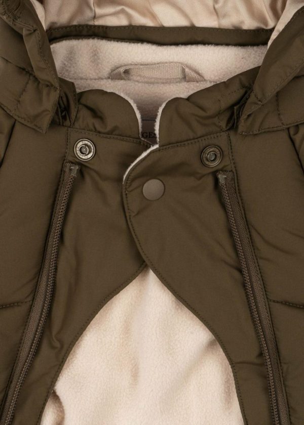 Warm winter suit with a detachable hood and fleece lining in body and collar. Practical front zippers that can be fully opened for easy dressing.